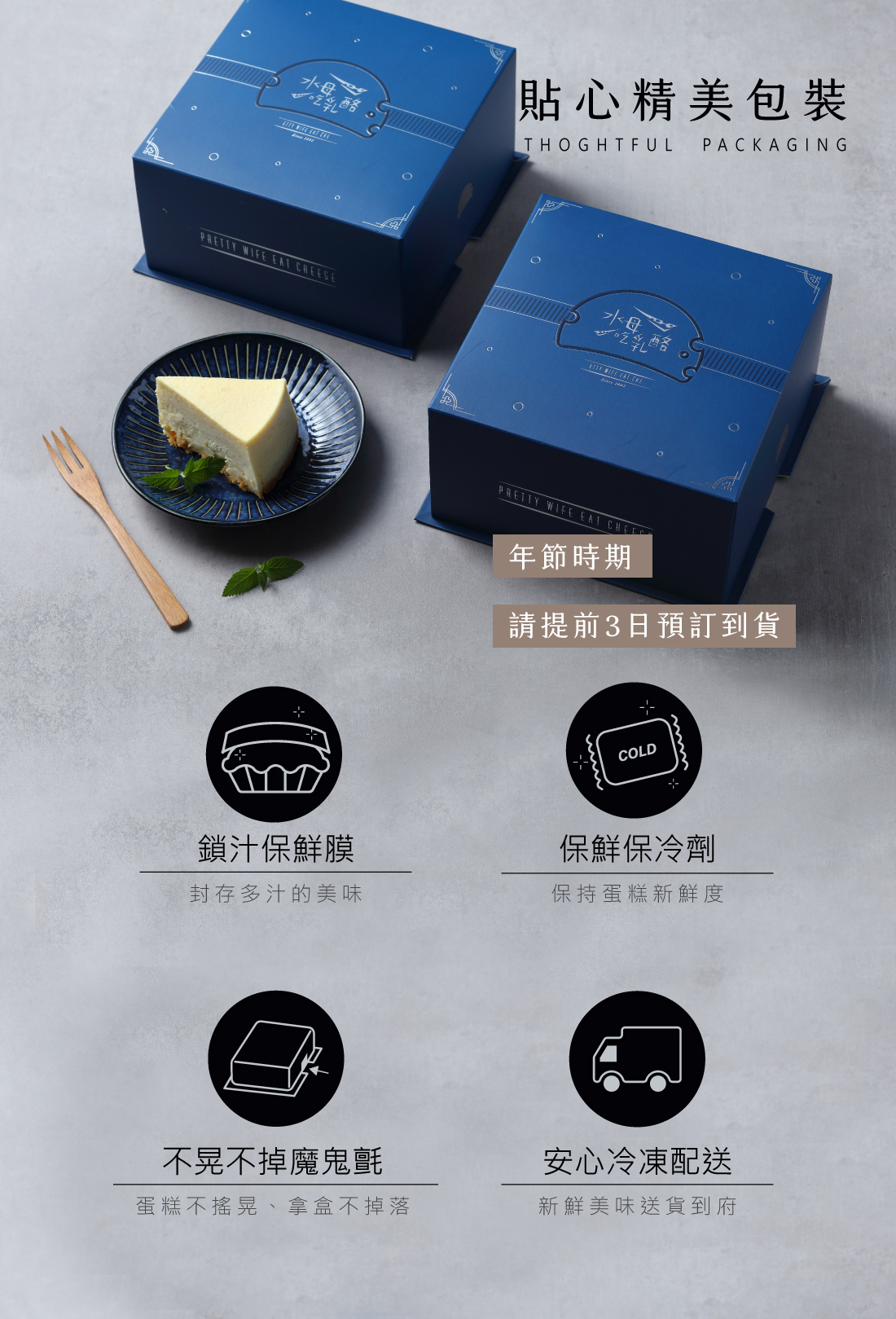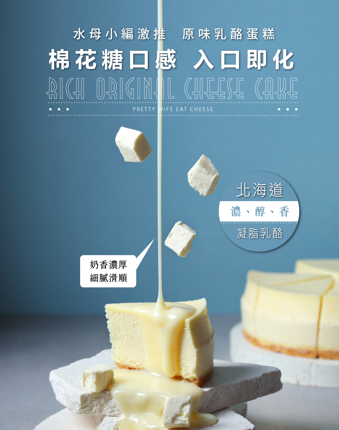 乳酪蛋糕是水母吃乳酪的經典系列,以北海道乳酪凝脂製成,乳酪含量高達80%,利用日式低溫水浴工法,口感質地滑順香濃。三種吃法,有趣多變,冷凍吃起來就像雪糕,口感濃郁沁涼;冷藏吃起來濕潤綿密、入口即化;微波吃起來就像舒芙蕾口感,鬆軟細緻。