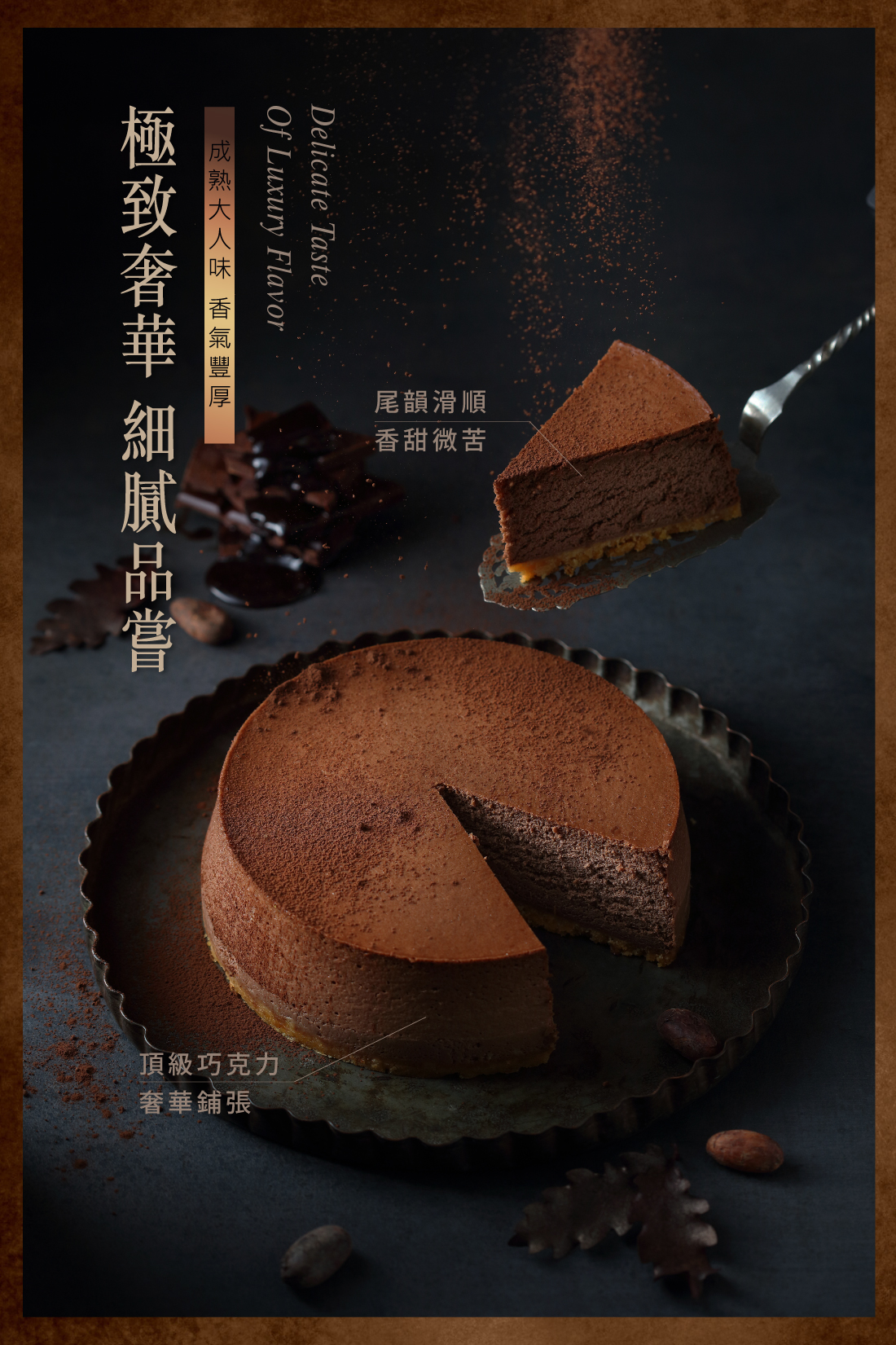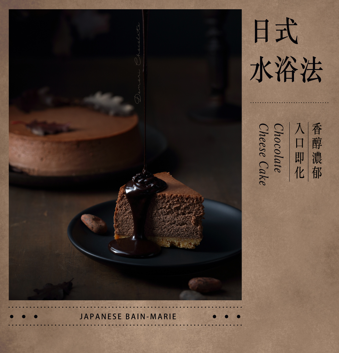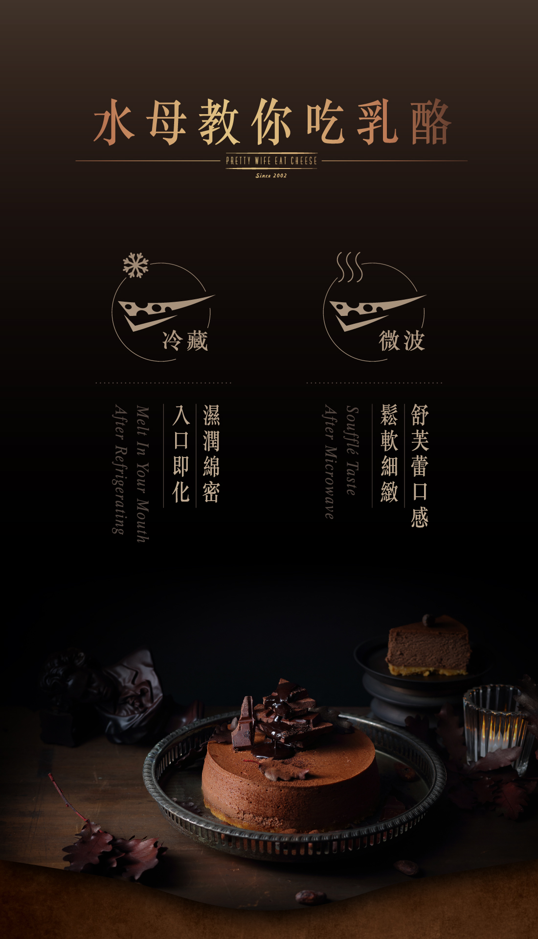 以北海道乳酪凝脂製成,乳酪含量高達80%,並選用義大利進口72%苦甜巧克力。利用日式低溫水浴工法,口感質地滑順香濃。三種吃法,有趣多變,冷凍吃起來就像雪糕,口感濃郁沁涼;冷藏吃起來濕潤綿密、入口即化;微波吃起來就像舒芙蕾口感,鬆軟細緻。