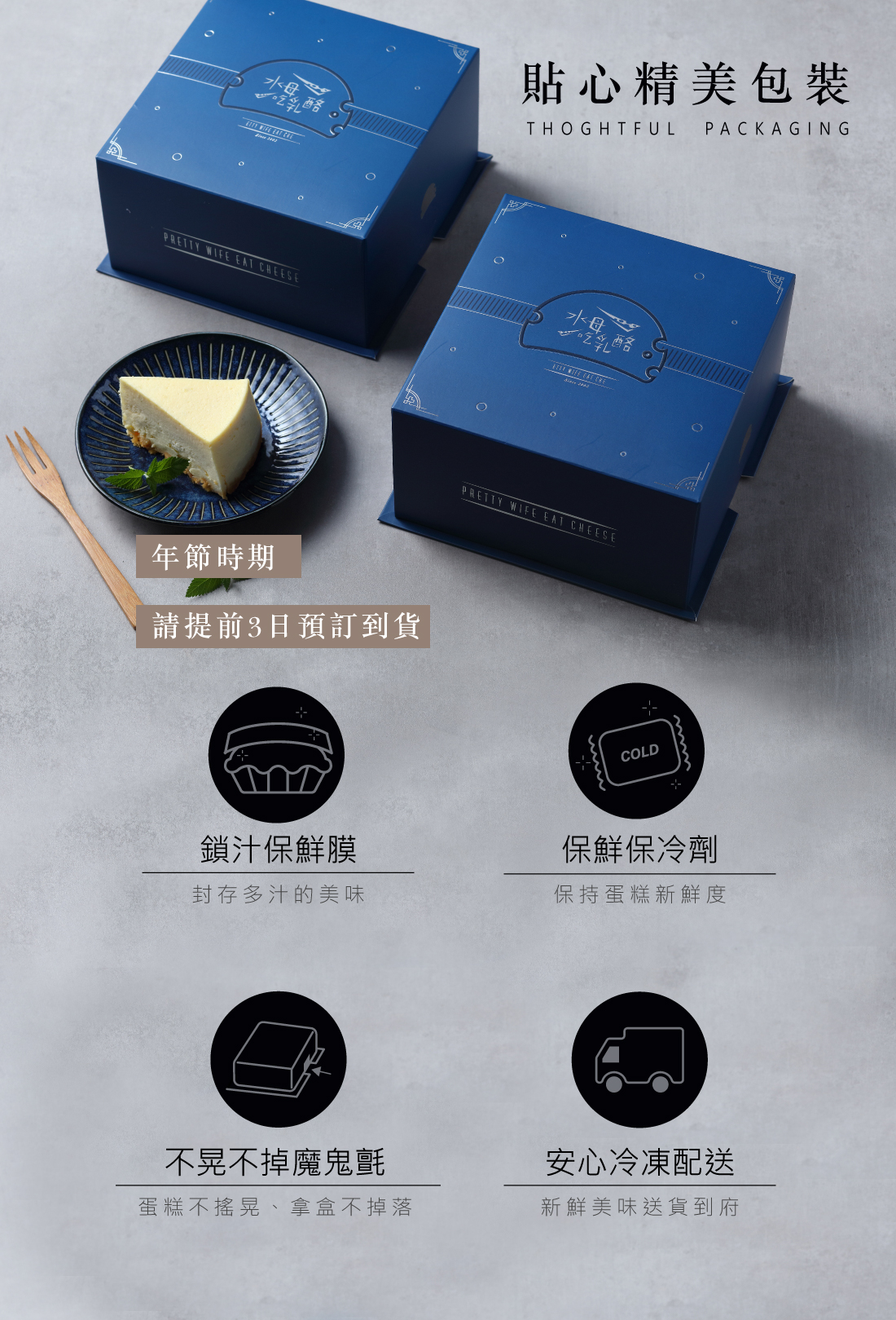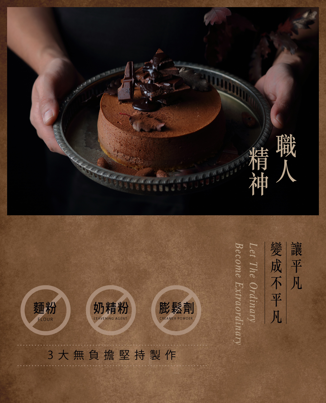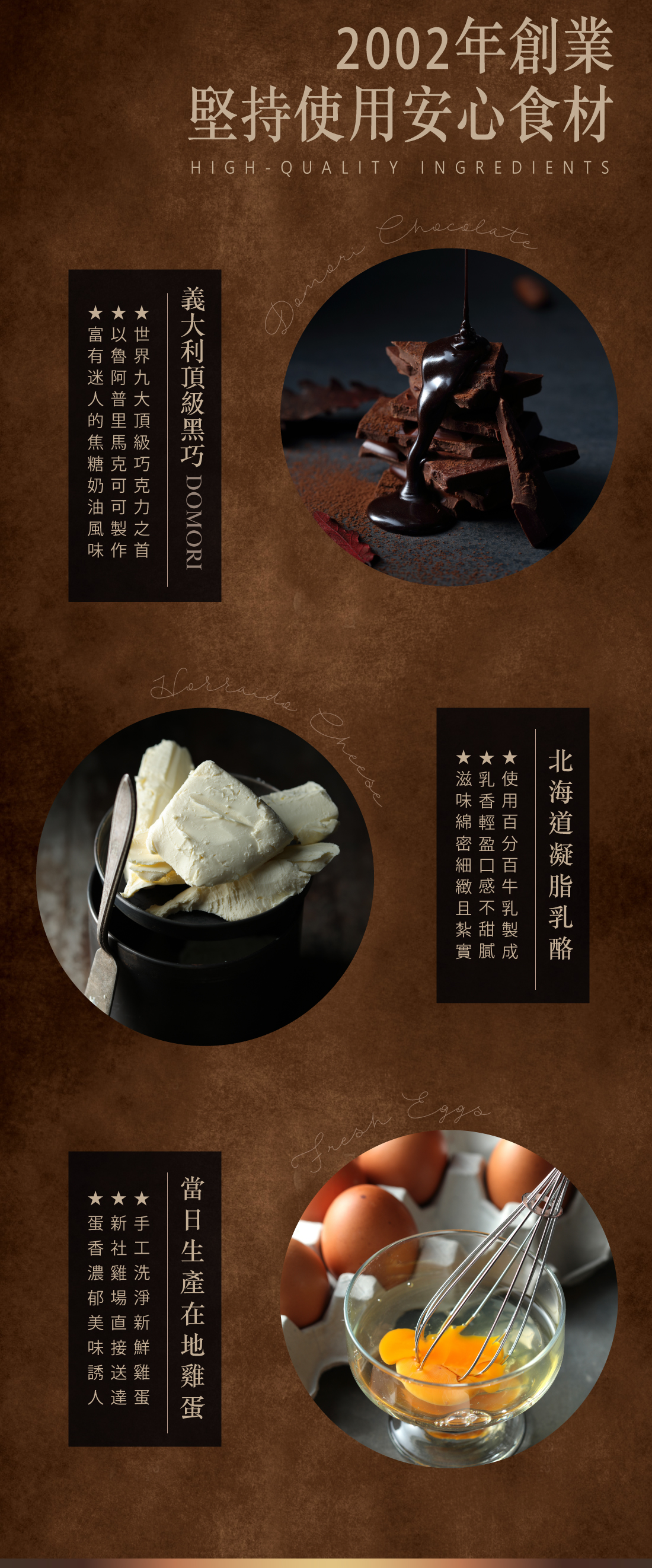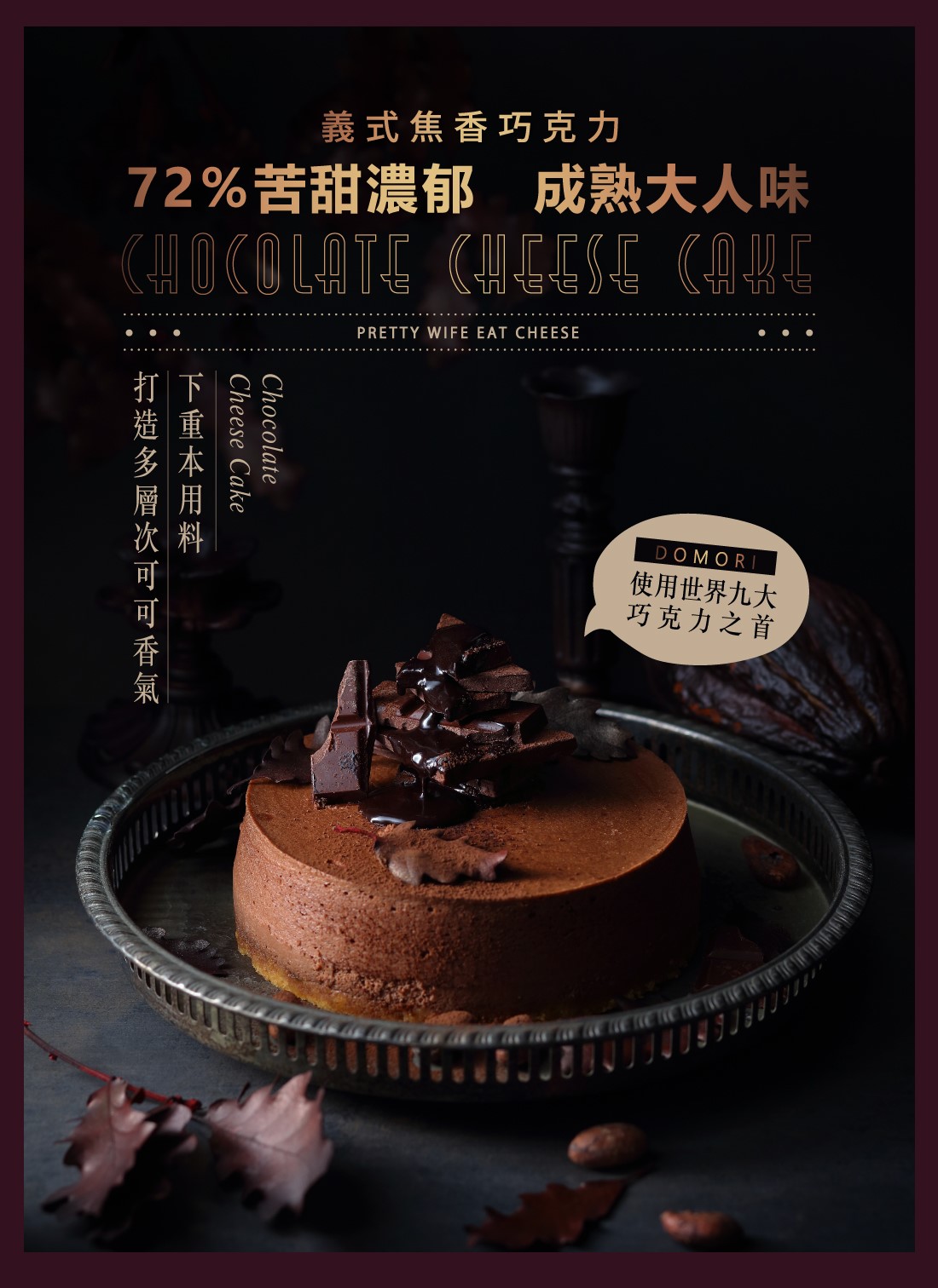 以北海道乳酪凝脂製成,乳酪含量高達80%,並選用義大利進口72%苦甜巧克力。利用日式低溫水浴工法,口感質地滑順香濃。三種吃法,有趣多變,冷凍吃起來就像雪糕,口感濃郁沁涼;冷藏吃起來濕潤綿密、入口即化;微波吃起來就像舒芙蕾口感,鬆軟細緻。