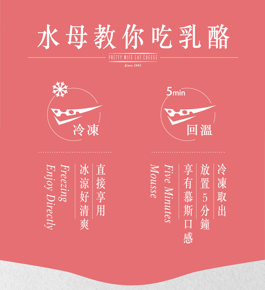 生乳酪是水母吃乳酪的清爽系列,透過乳酪與新鮮果汁調和,無烘烤且無蛋無麵粉,乳酪含量達60%,冷凍吃起來就像優格冰;稍微回溫後如果泥慕斯。