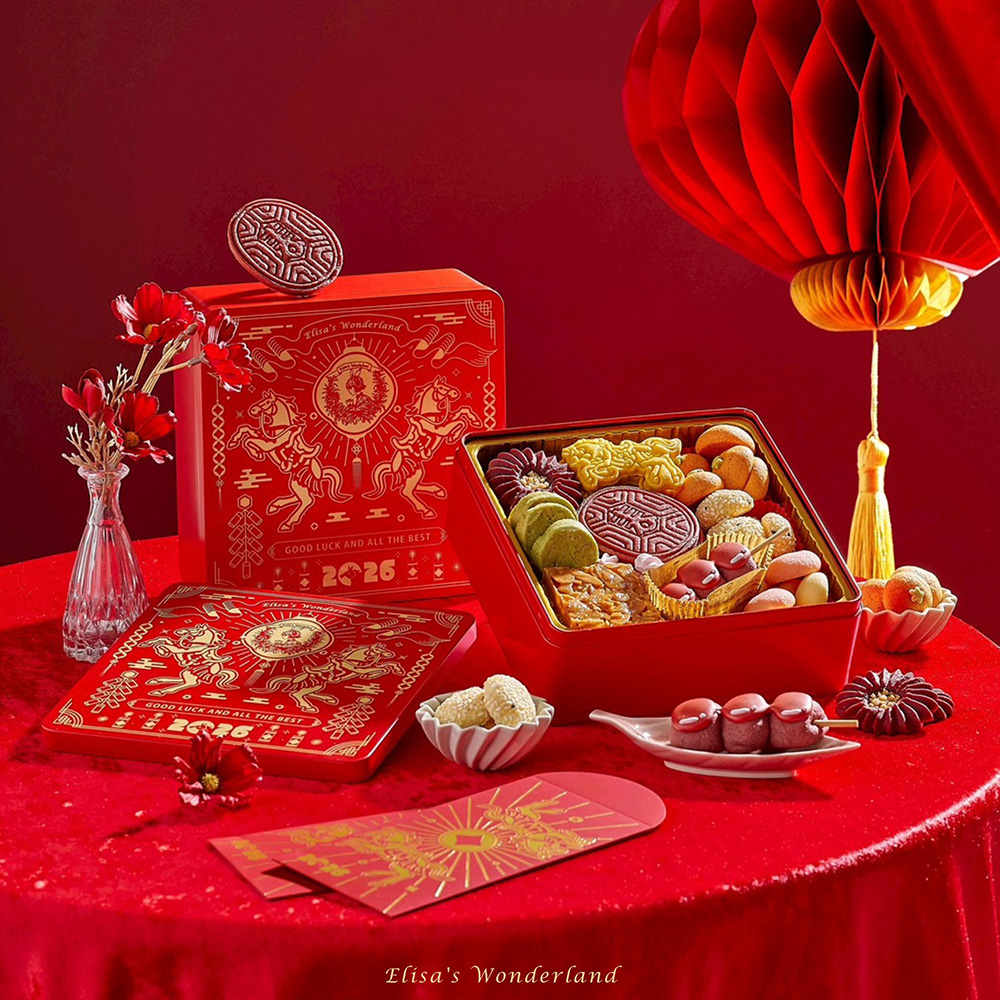 融合台式與西式手工餅乾,以祥馬、紅龜粿、柿子、湯圓等寓意好運的節慶造型呈現。嚴選法國 AOP 奶油、日本麵粉與天然素材,香氣細緻、口感清爽。紅金禮盒象徵福氣奔騰,是新年送禮的頂級之選。