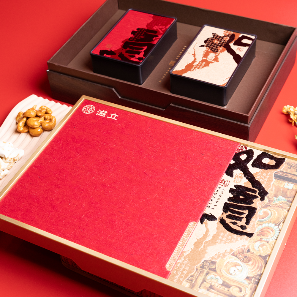 「新春如意」禮盒,採用厚磅質感的正紅色盒身,搭配典雅的設計腰封。
