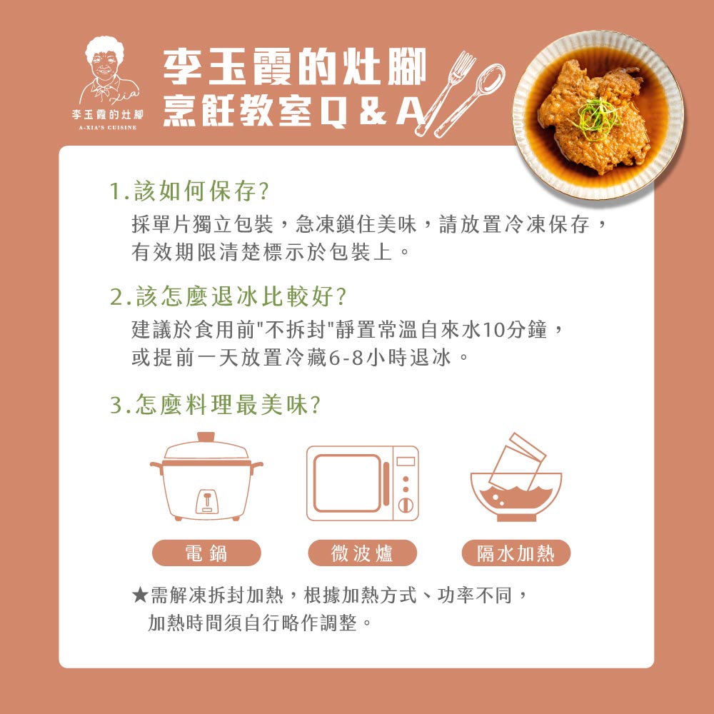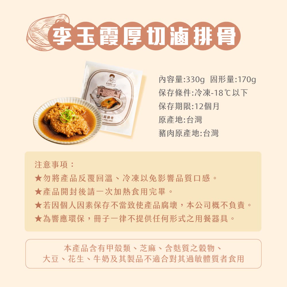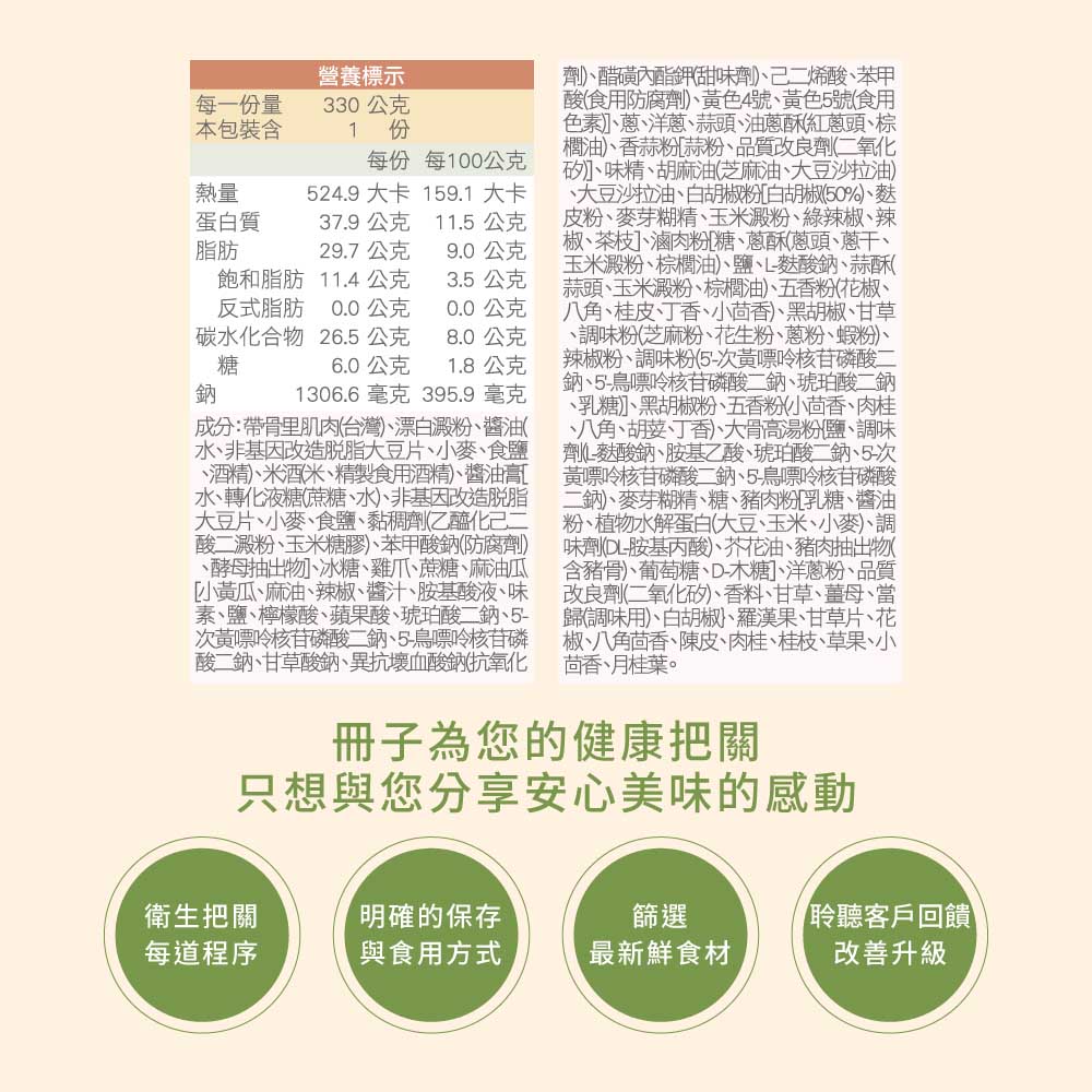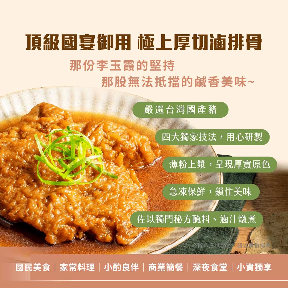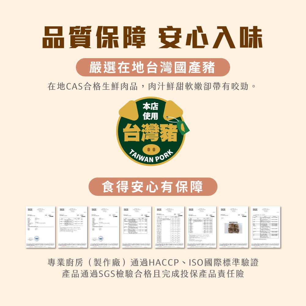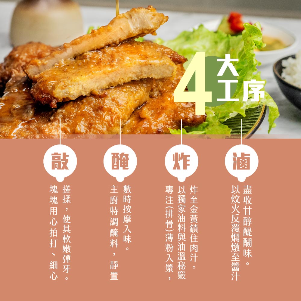 嚴選台灣國產豬,四大獨家技法用心研製,薄粉上漿呈現厚實原色,佐以獨門秘方醃料、滷汁燉煮而成。