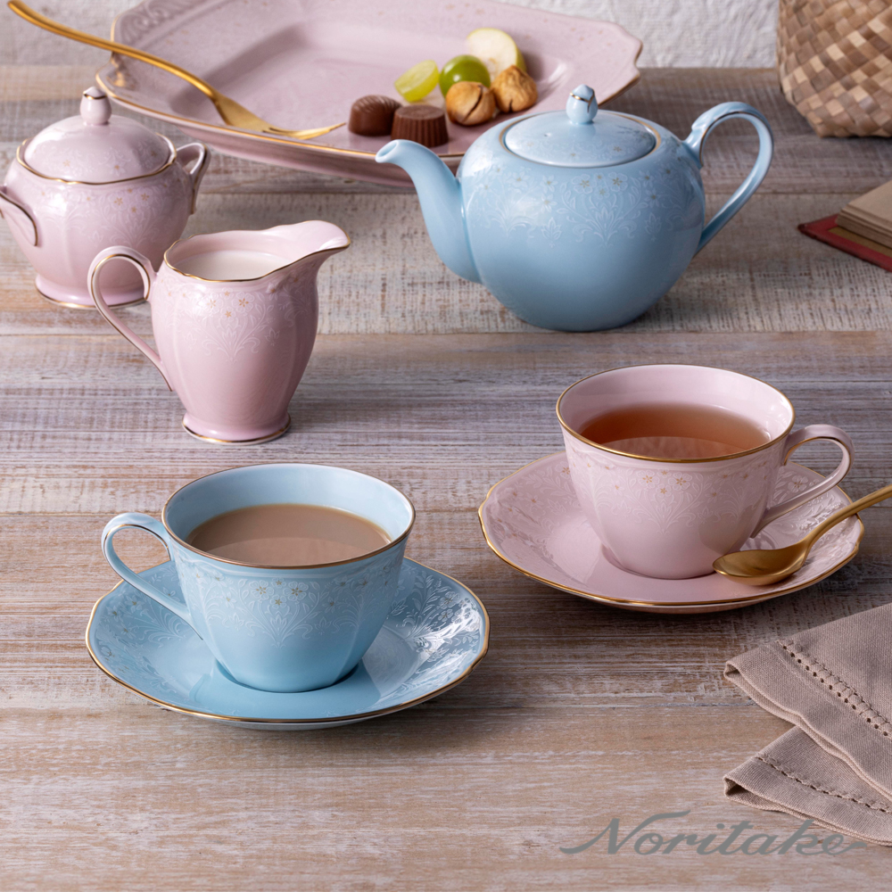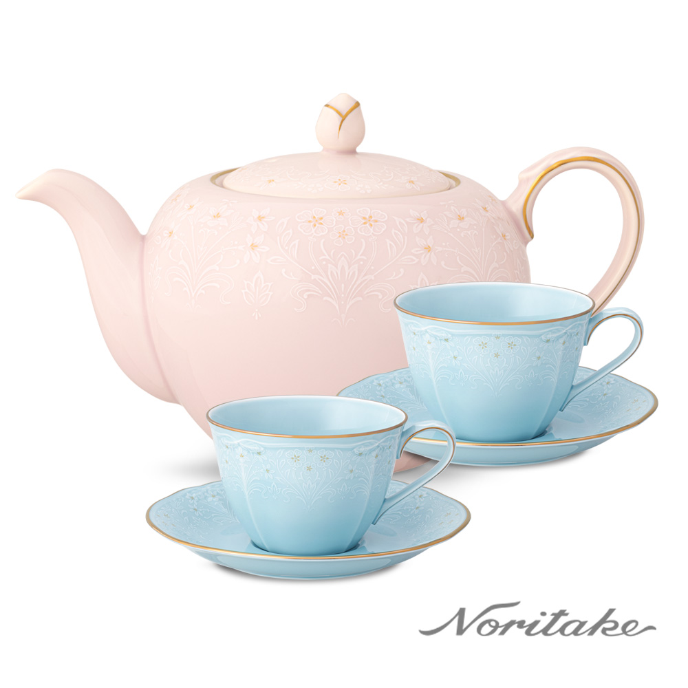新芽-下午茶杯碟5件組_粉茶壺+藍咖啡對杯(禮盒組)(可微波)