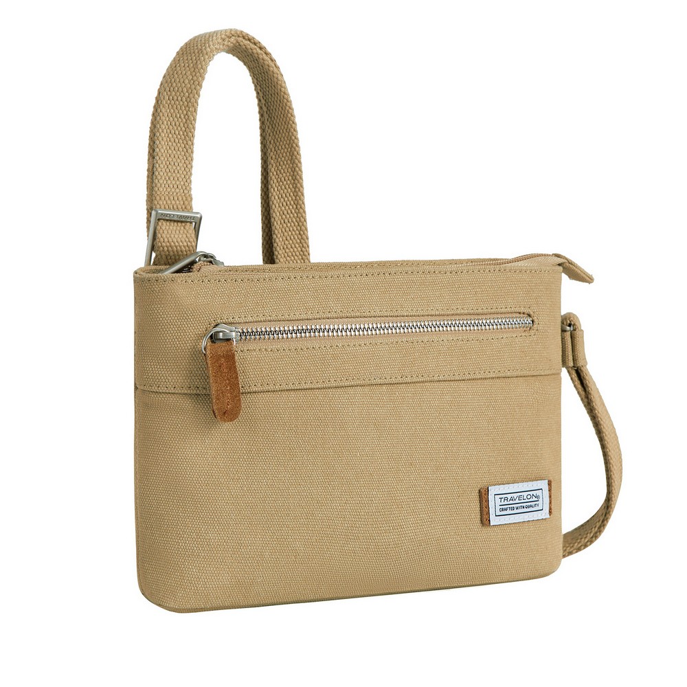 美國 TRAVELON - Heritage帆布3層弧型防盜斜背包(牛仔沙) / 側背包 斜肩包 小包 背帶包 防割防搶