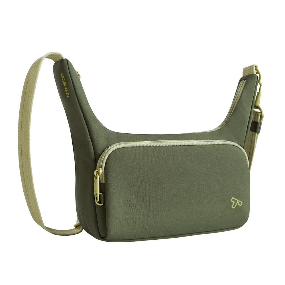 美國 TRAVELON - Runways 3層防盜斜背旋鈕彎月包(拿鐵棕) / RFID防盜包 斜背包 側背包 防割防搶