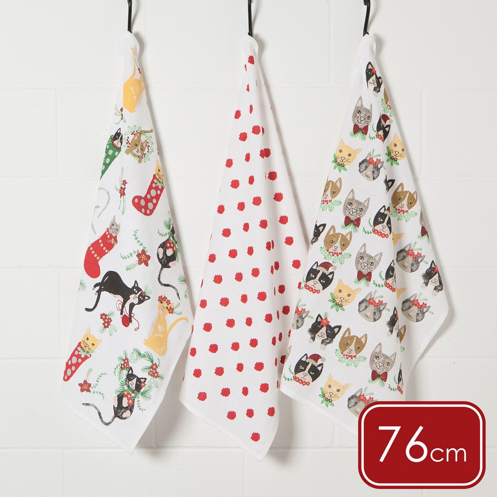 加拿大 danica studio - Jubilee純棉茶巾擦拭布3入(貓咪過聖誕76cm) / 廚房抹布 擦拭布