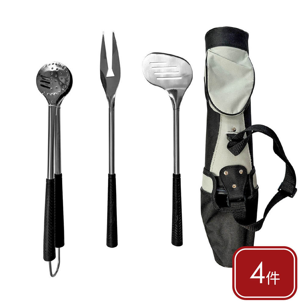 美國 OUTSET - Golf Club附袋不鏽鋼烤肉用具3件 / 燒烤用具組 濾油鏟 烤肉夾 烤肉叉