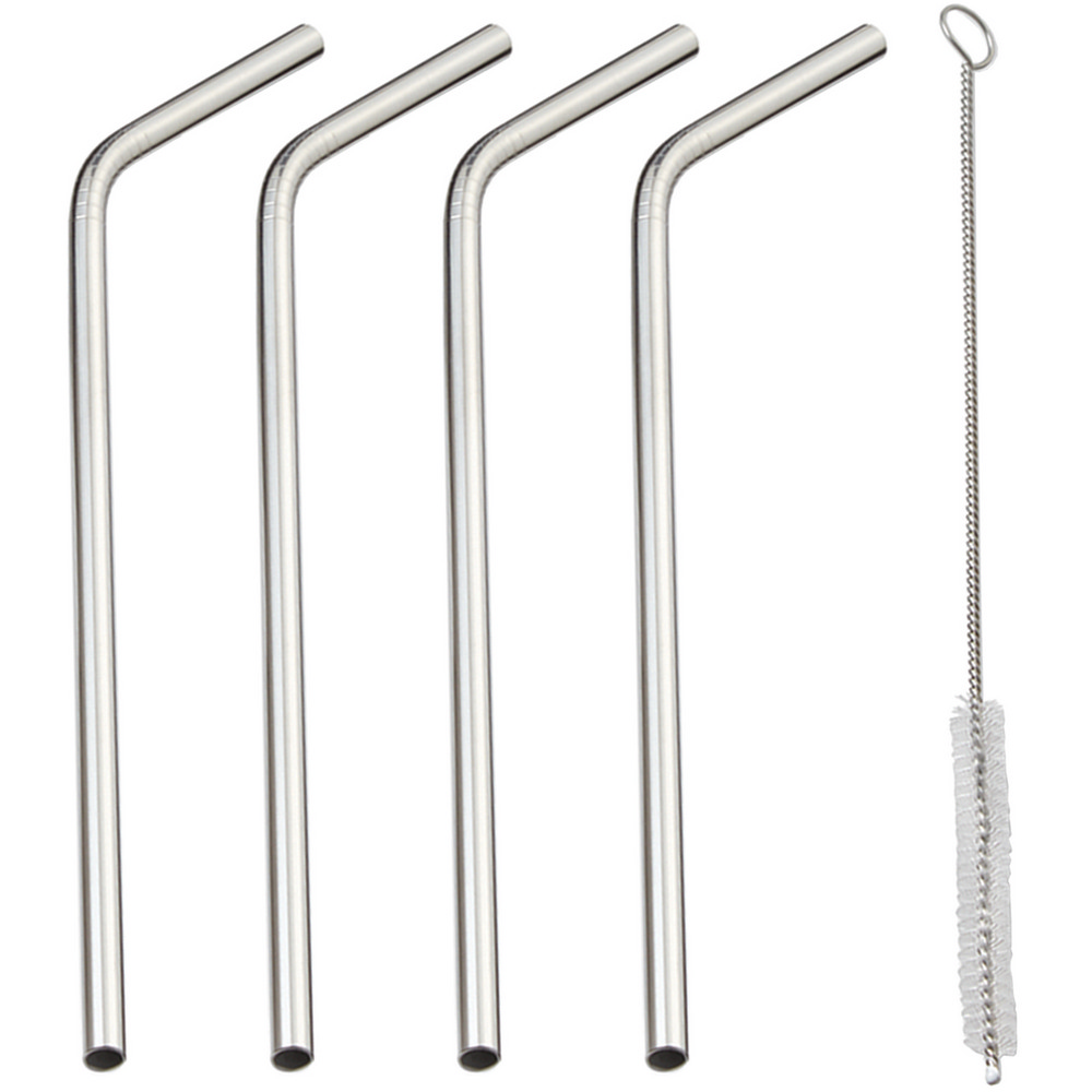 美國 OUTSET - 不鏽鋼彎吸管4入+清潔刷 / 環保吸管 飲料杯 手搖杯 吸管刷