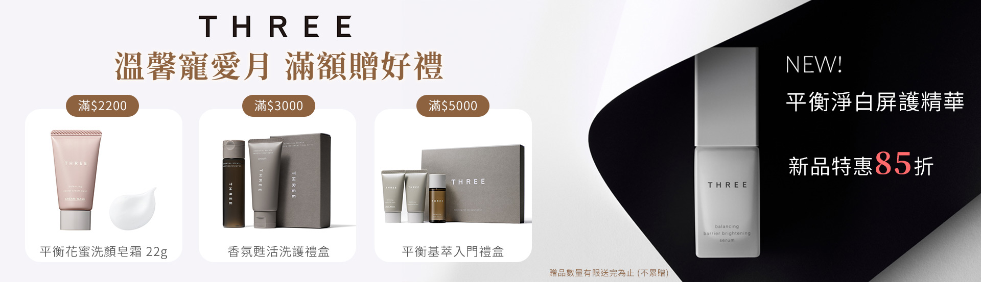 THREE溫馨寵愛|凡消費滿額$2200/ $3000/ $5000,加贈回饋好禮。贈品數量有限送完為止(不累贈)